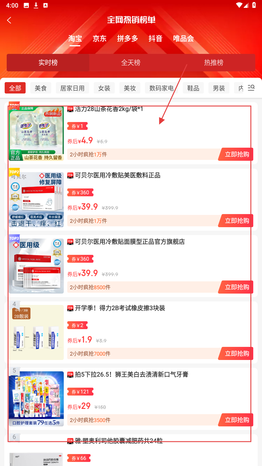 2、点【全网热销榜】,选实时/全天/热推榜,挑活力28洗衣液等爆款。