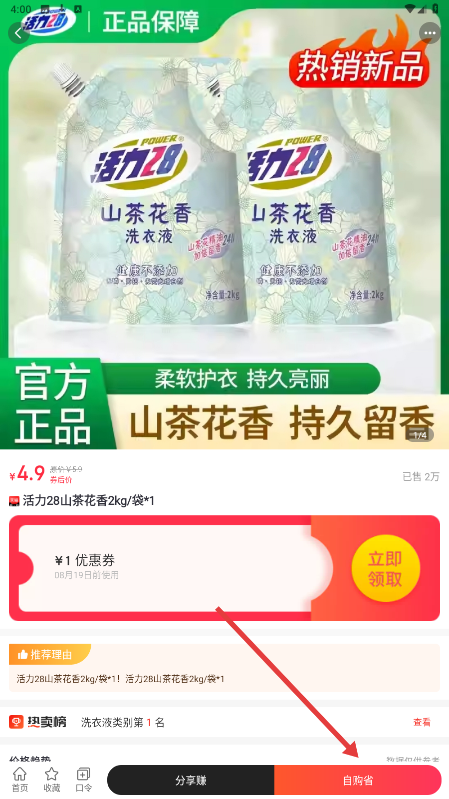 3、进商品详情,领优惠券后点【自购省】,享山茶花香洗衣液实惠价。