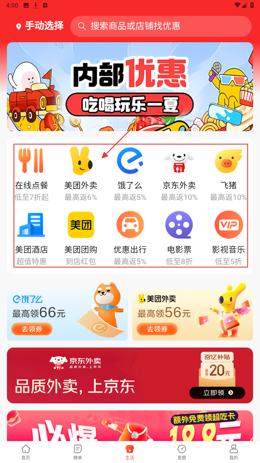 4、切换【生活】页,用美团外卖等入口,领优惠点外卖、订酒店等。
