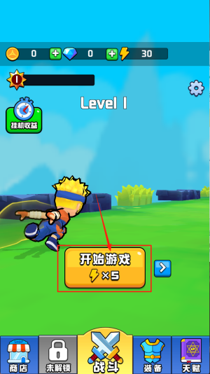 1、进入主界面:点击“开始游戏”按钮,进入关卡1/11,查看当前等级与收益。