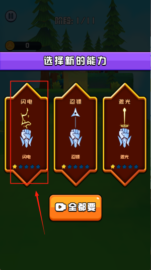 4、选择能力:通关后进入能力选择界面,点击“闪电”图标,再点“D全都要”确认获取。