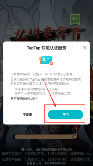 2、启用TapTap认证:在快速认证提示页,点击“使用”一键完成实名。