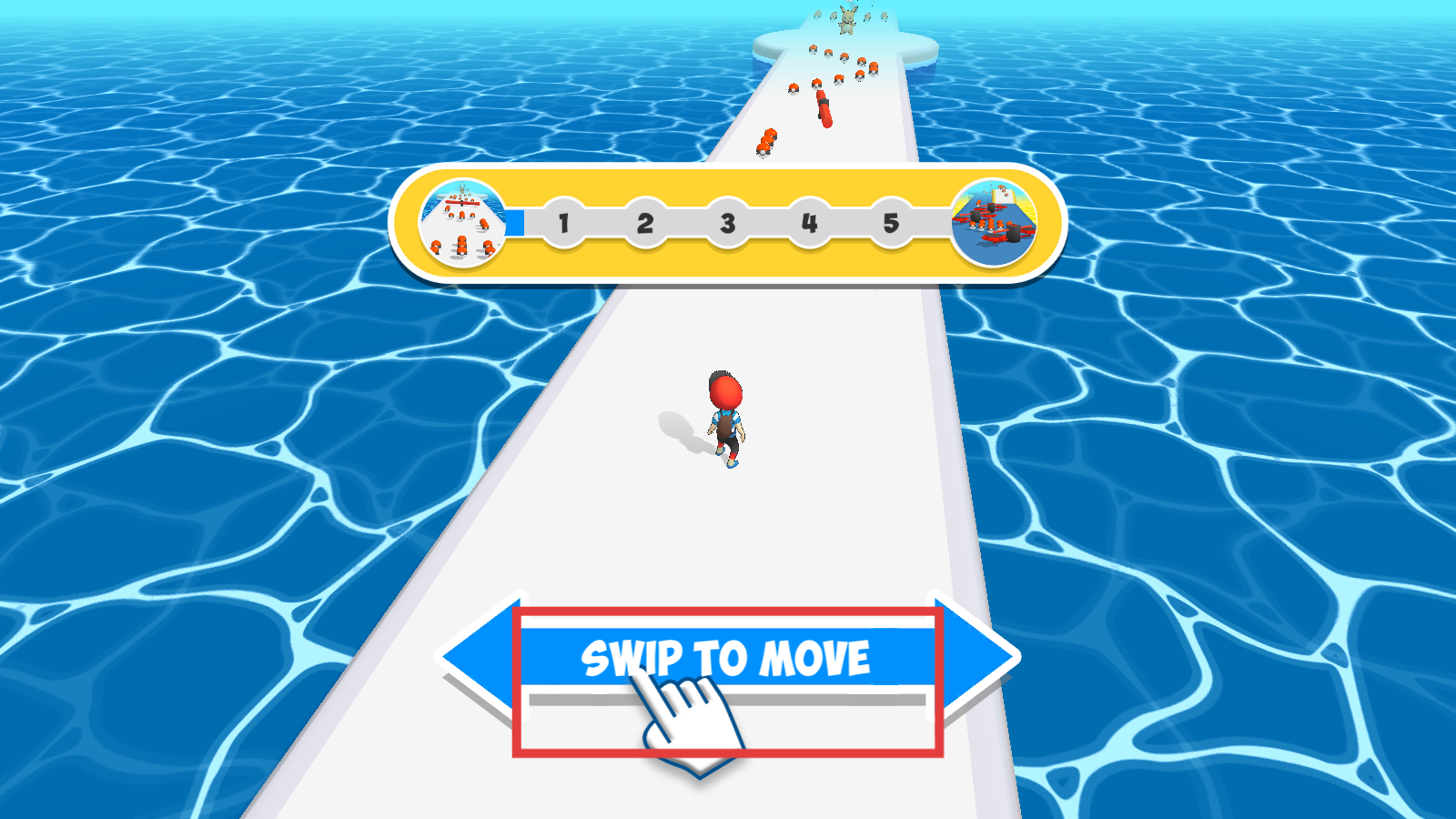 1、点击【SWIP-TO-MOVE】,操控角色踏上水上跑道,开启收集精灵球的冒险之旅。