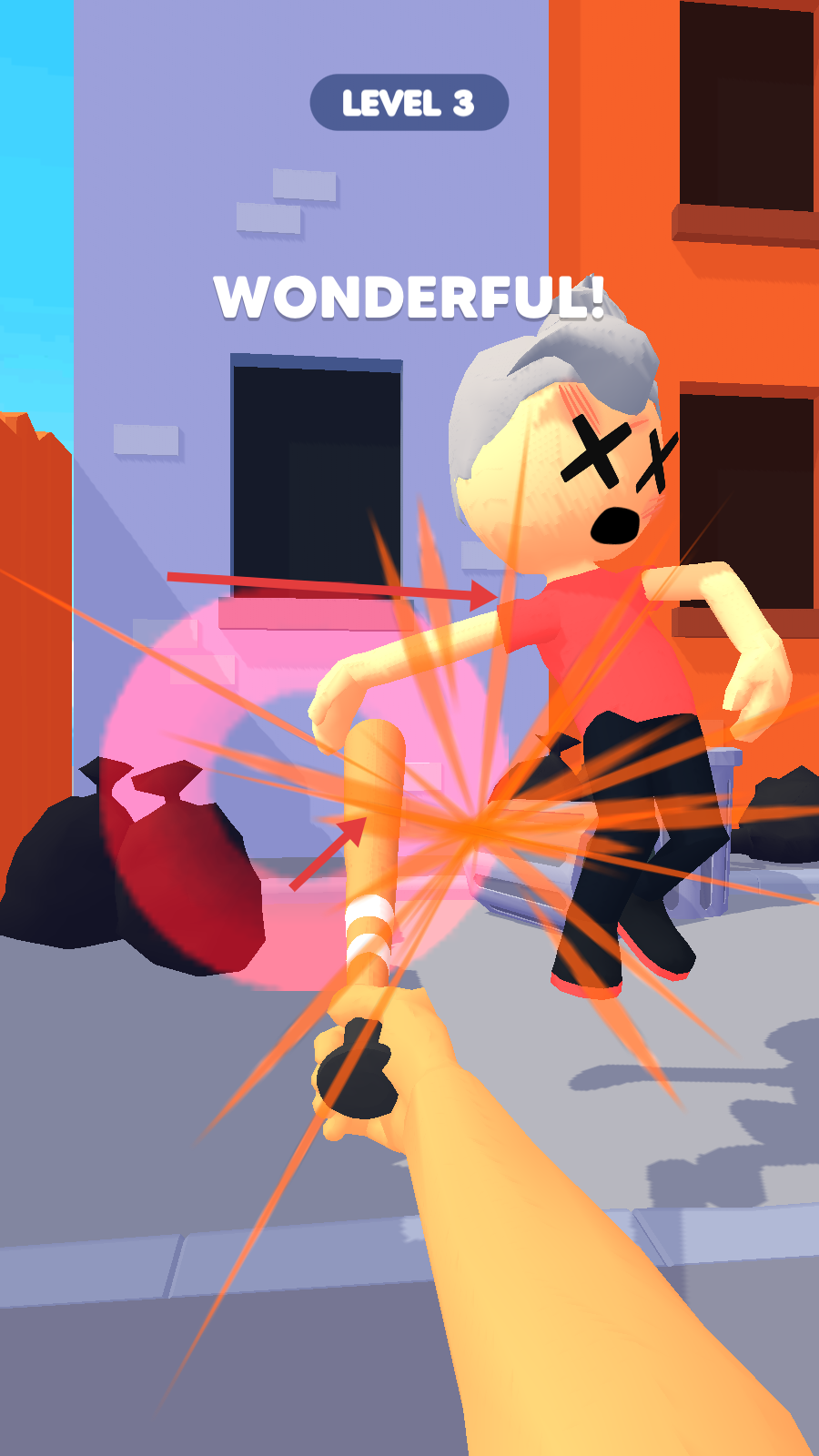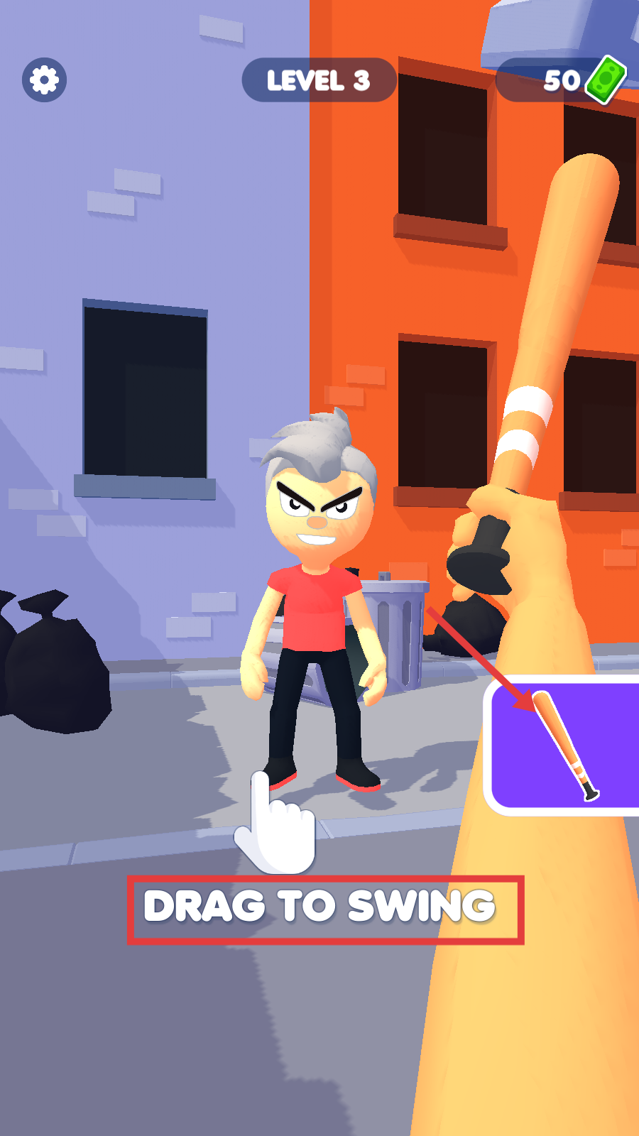 1、点击【DRAG-TO-SWING】,拖动棒球棍蓄力,瞄准红衣敌人,开启LEVEL-3战斗。