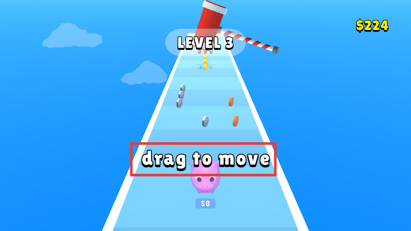 1、进入【LEVEL-3】关卡,根据【drag-to-move】提示,拖动粉色小猪沿跑道收集金币与银币。