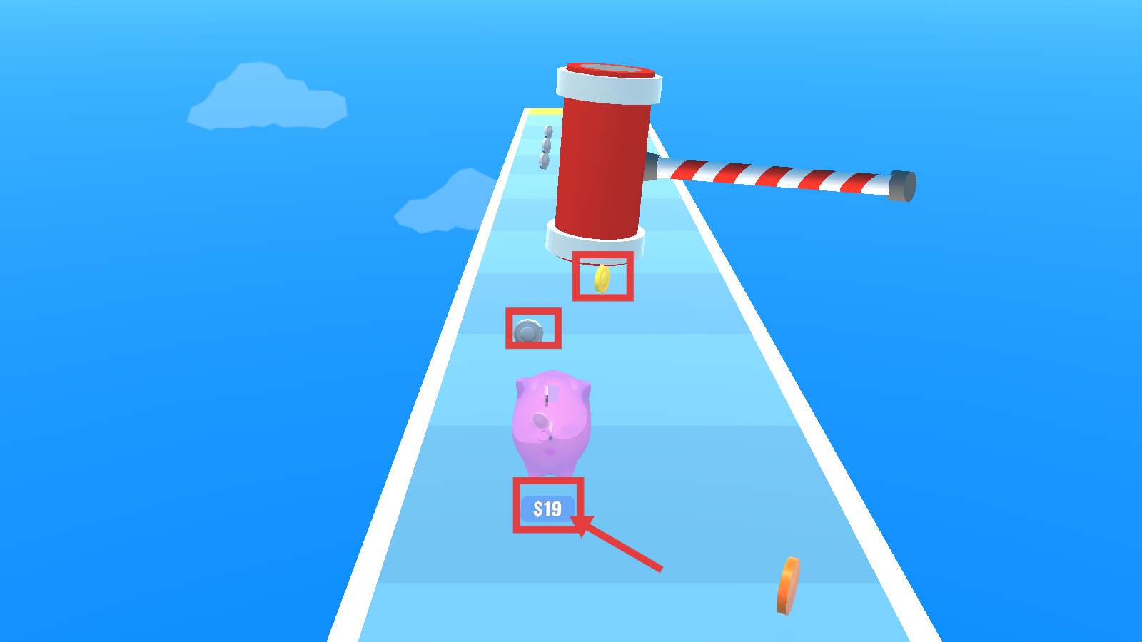 2、操控小猪前行,收集路径上的【金币】【银币】,积累【$19】财富,同时规避巨型障碍。