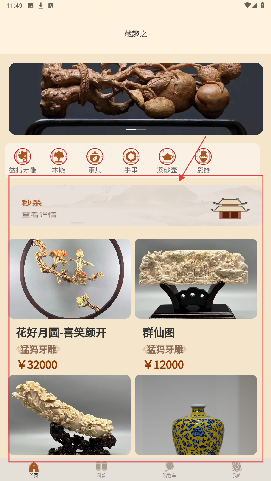 1、进入【藏趣之】首页,选猛犸牙雕等品类,浏览秒杀商品挑心仪好物。