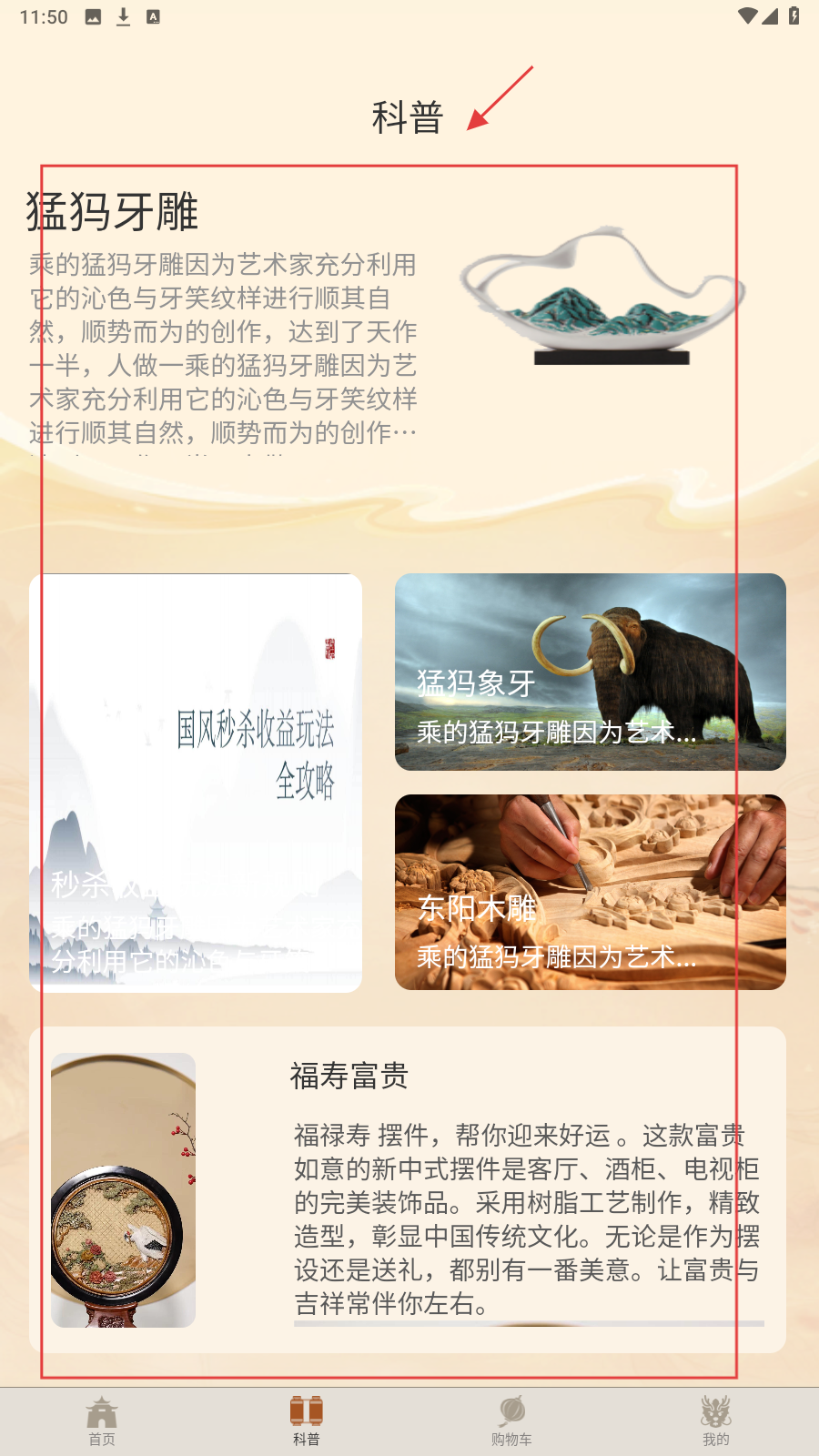 3、点【科普】板块,读猛犸牙雕等知识,提升文玩认知助力选购。