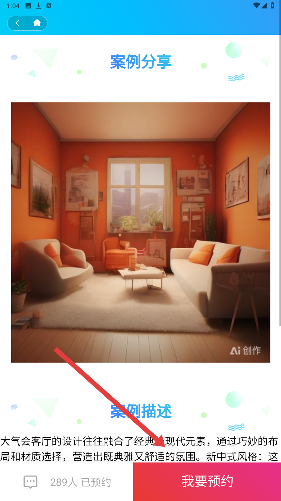 3、选心仪案例,读【案例描述】后点【我要预约】,启动家装咨询流程。