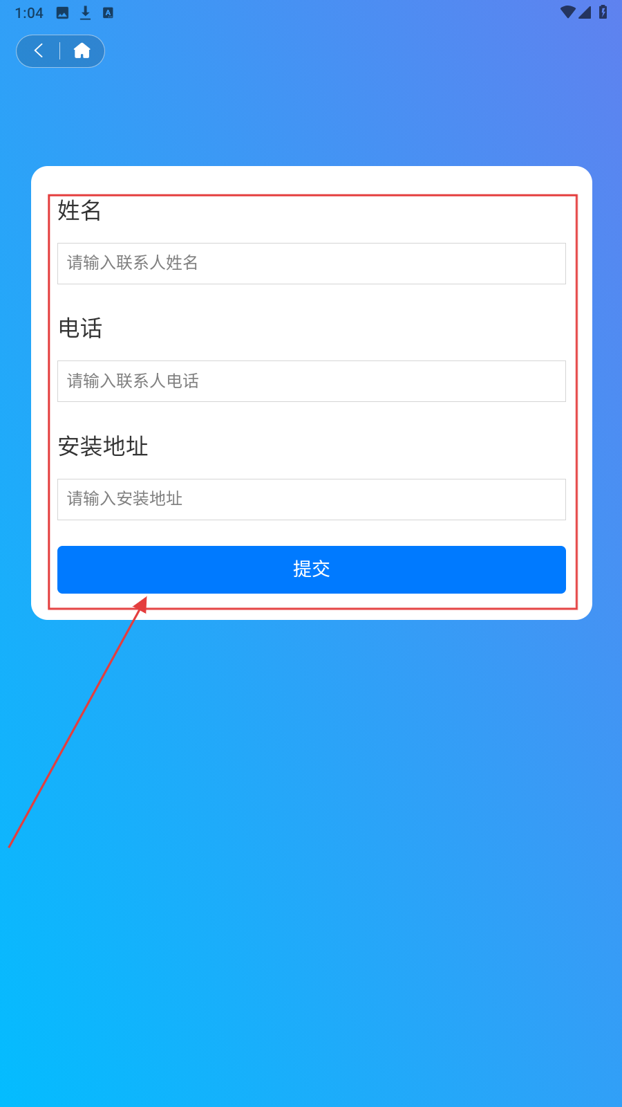 4、填姓名、电话、安装地址,点【提交】,完成家装预约信息提交。