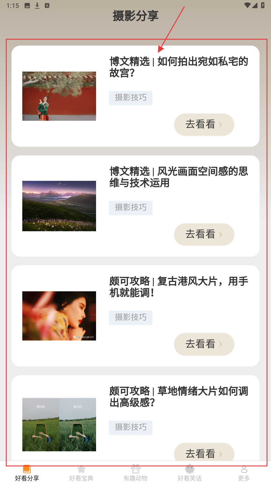 1、进入【摄影分享】页面,选感兴趣的【博文精选】,学习摄影技巧提升水平。