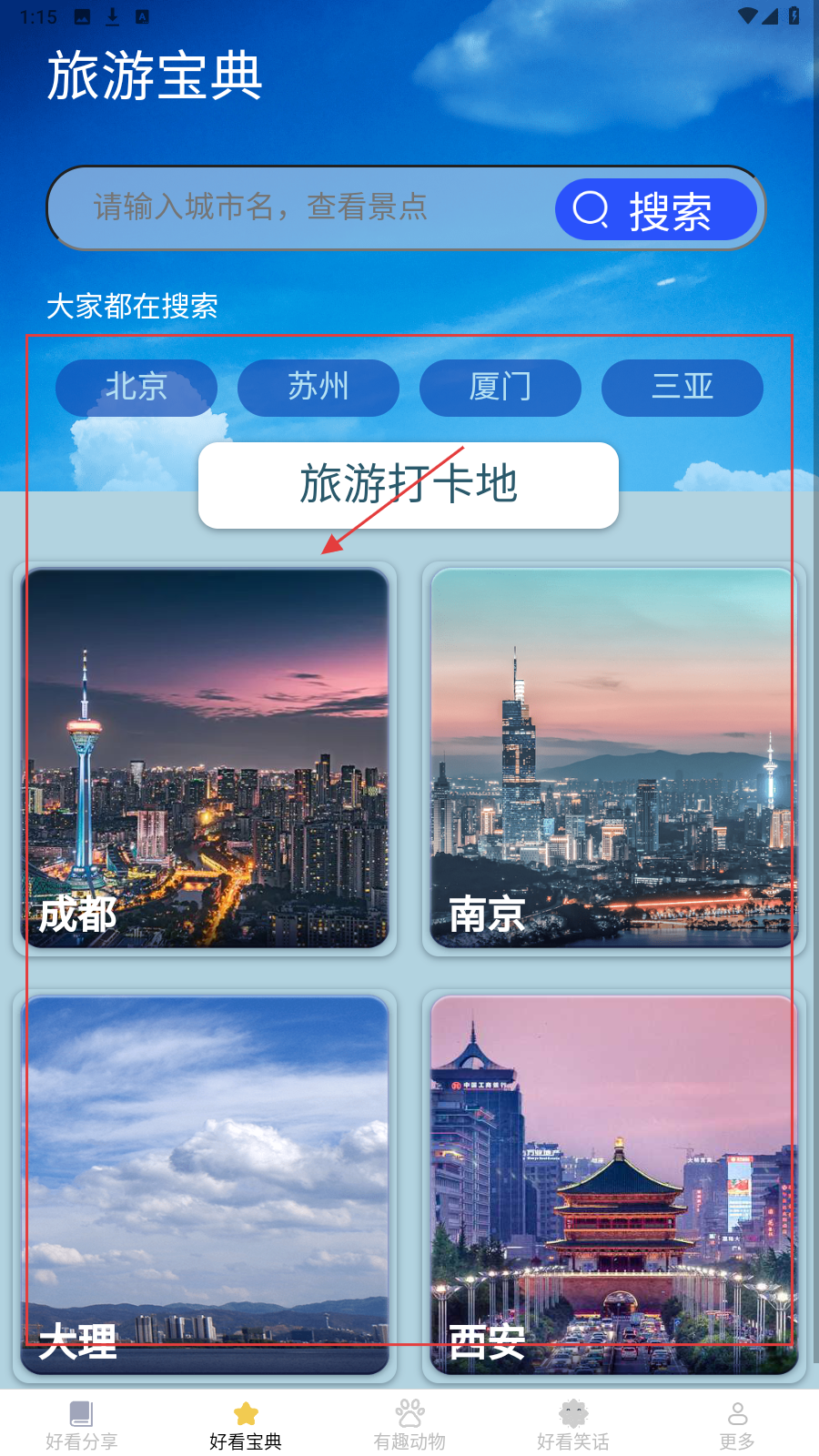 3、切换到【旅游宝典】,挑心仪城市(如成都),查看旅游打卡地详情规划行程。