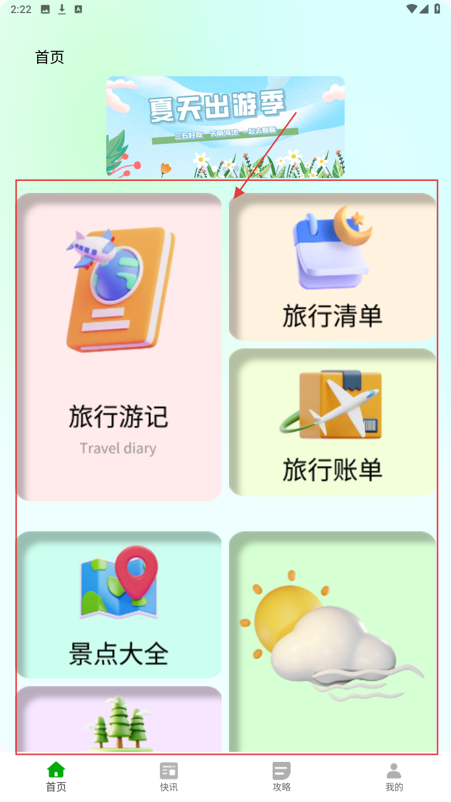 1、首页选【旅行游记】,记录旅途见闻,或看他人分享找灵感。