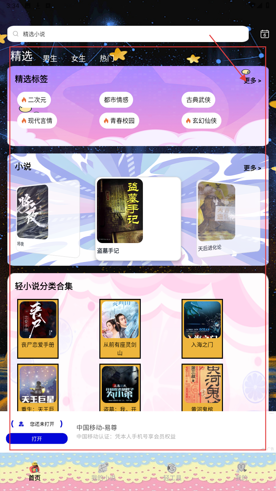 1、在首页【精选标签】点【更多】,可探索全部分类找心仪小说。