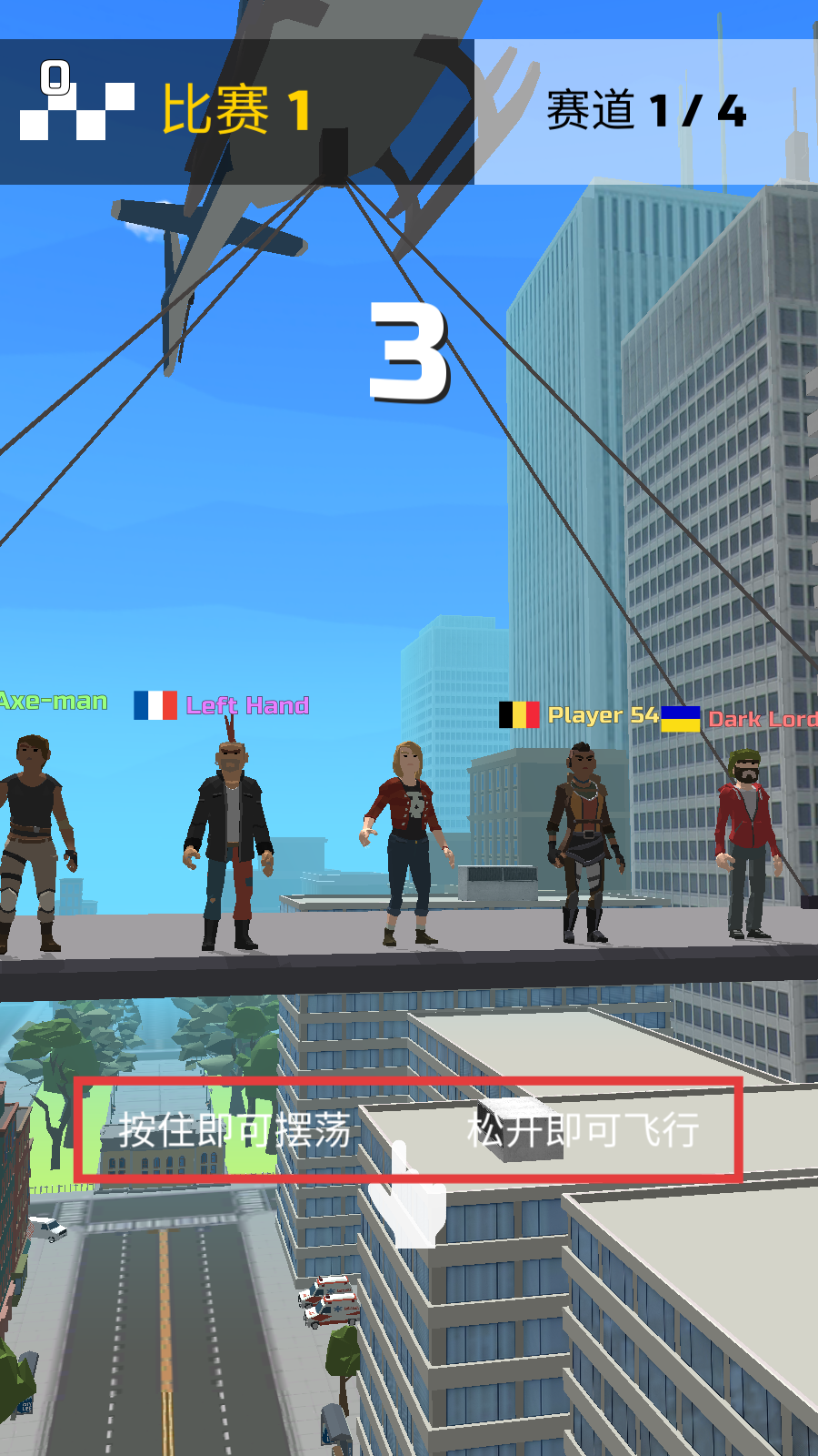 2、比赛前牢记【按住即可摆荡-松开即可飞行】规则,掌握空中移动核心操作。
