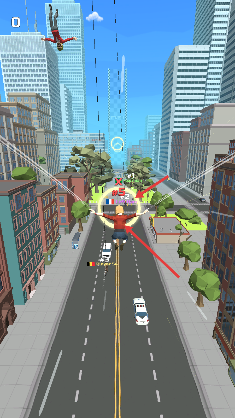 3、竞赛中运用摆荡-飞行技巧,紧盯【排名标识】,超越对手抢占赛道领先位置。