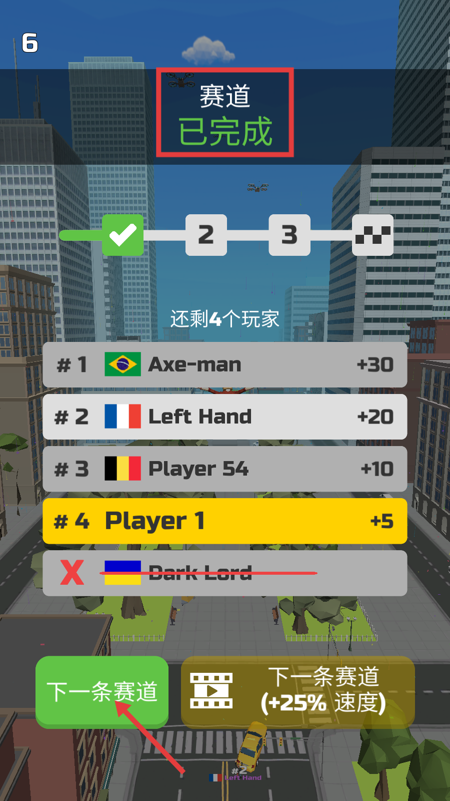 4、赛道完成后点击【下一条赛道】按钮,推进关卡,积累积分提升角色排名。