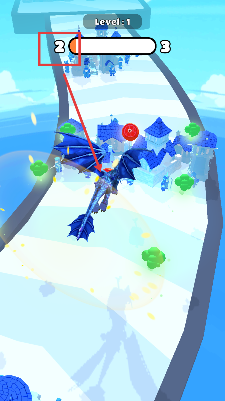 3、利用龙的攻击破坏建筑,紧盯上方【等级进度条】,推进关卡进程。