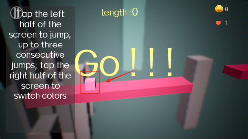 3、学习操作:阅读画面提示“点左半屏跳跃,最多连跳三次;点右半屏切换颜色”,熟悉基本操作。