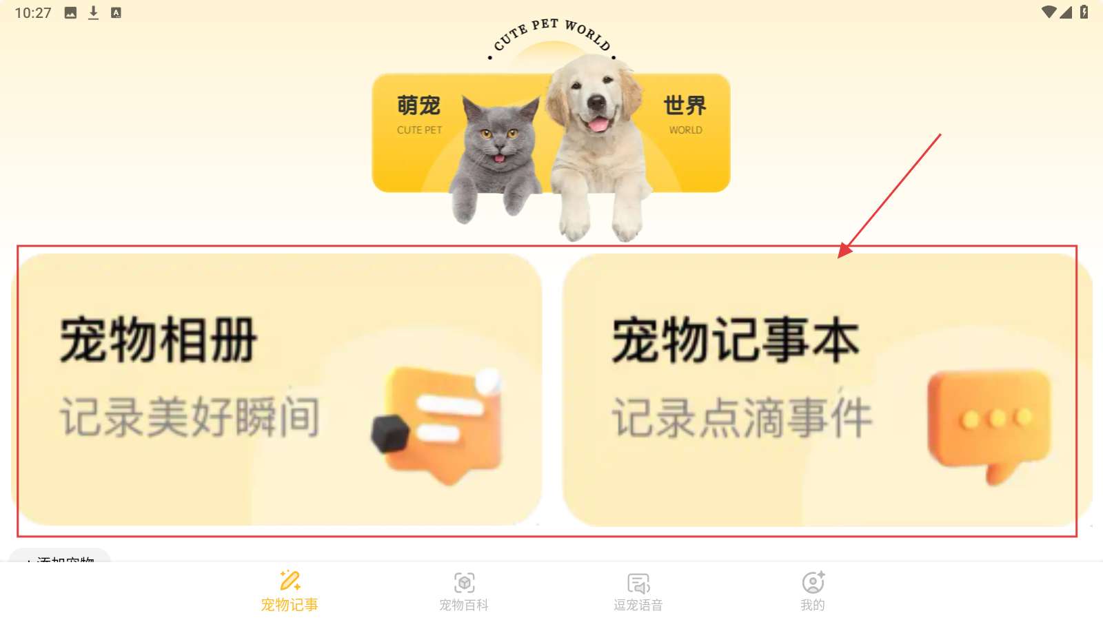 1、打开应用,在【宠物记事】页面,可以选择宠物相册或者宠物记事本进行编辑,如点击【宠物记事本】。