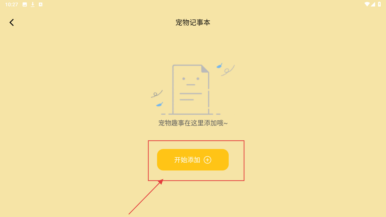 2、进入【宠物记事本】页面,点击【开始添加】按钮,进行创建。