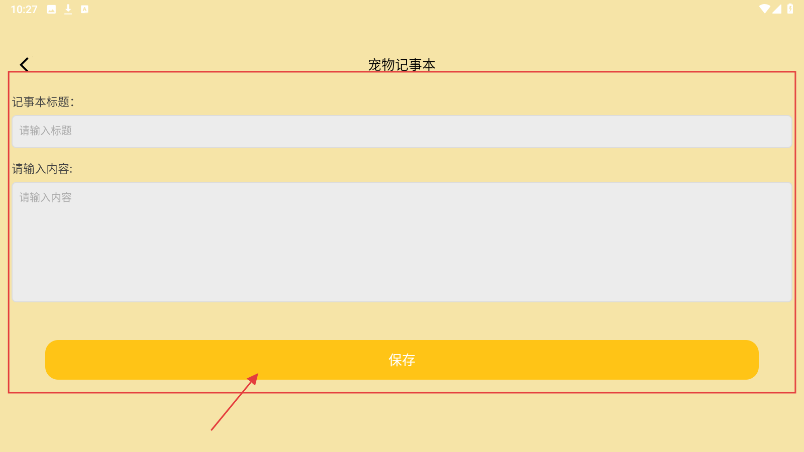 3、创建后,输入要记录的标题以及内容,输入完成点击【保存】按钮,记录与爱宠的趣事。
