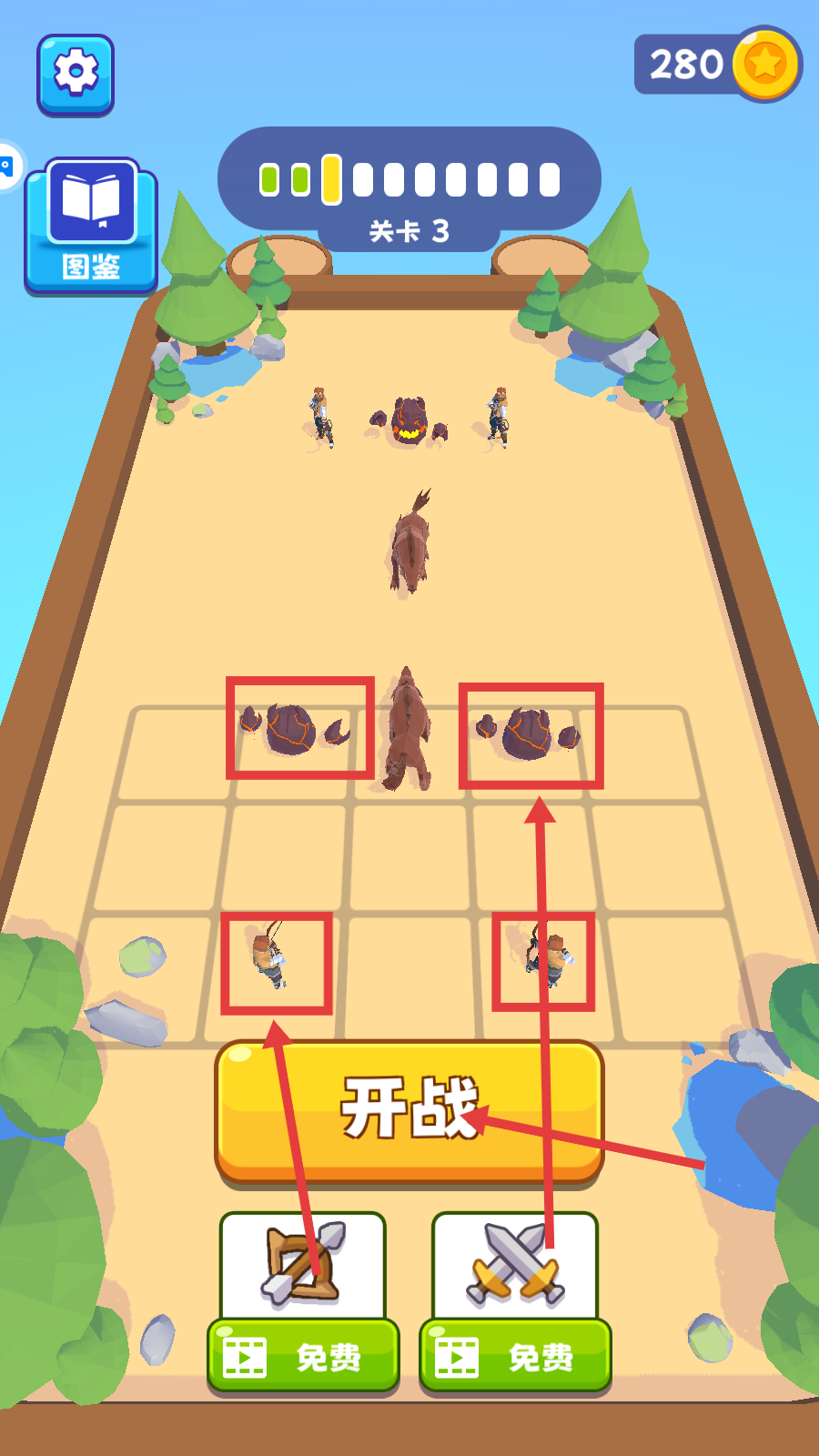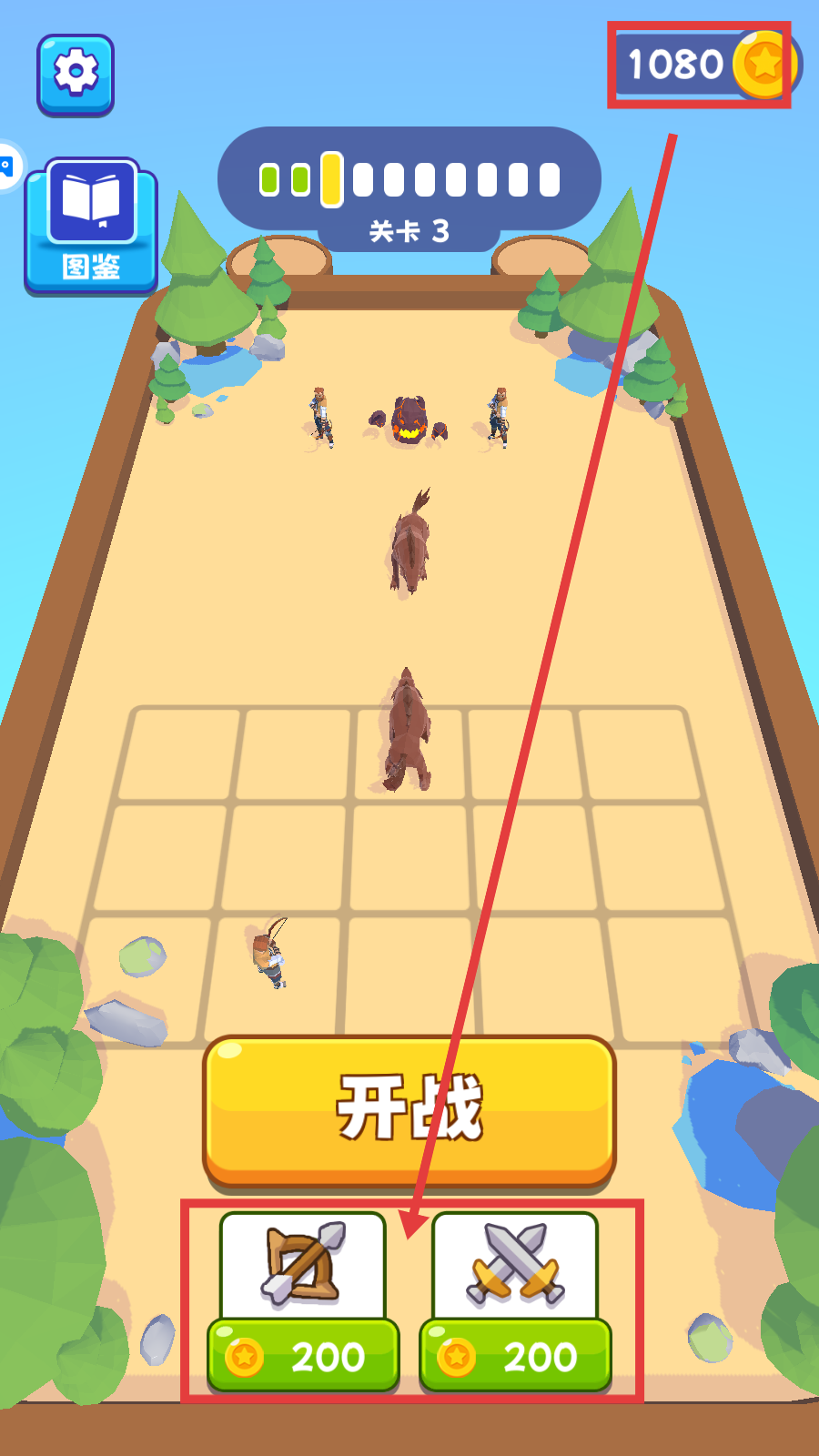 1、进入【关卡3】,消耗金币(如弓兵200)招募兵种,布置到战场格子,构建阵容。