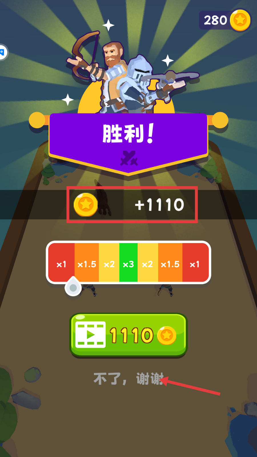 4、胜利获【+1110金币】,可选看广告翻倍,或点【不了,谢谢】直接结算,解锁后续。
