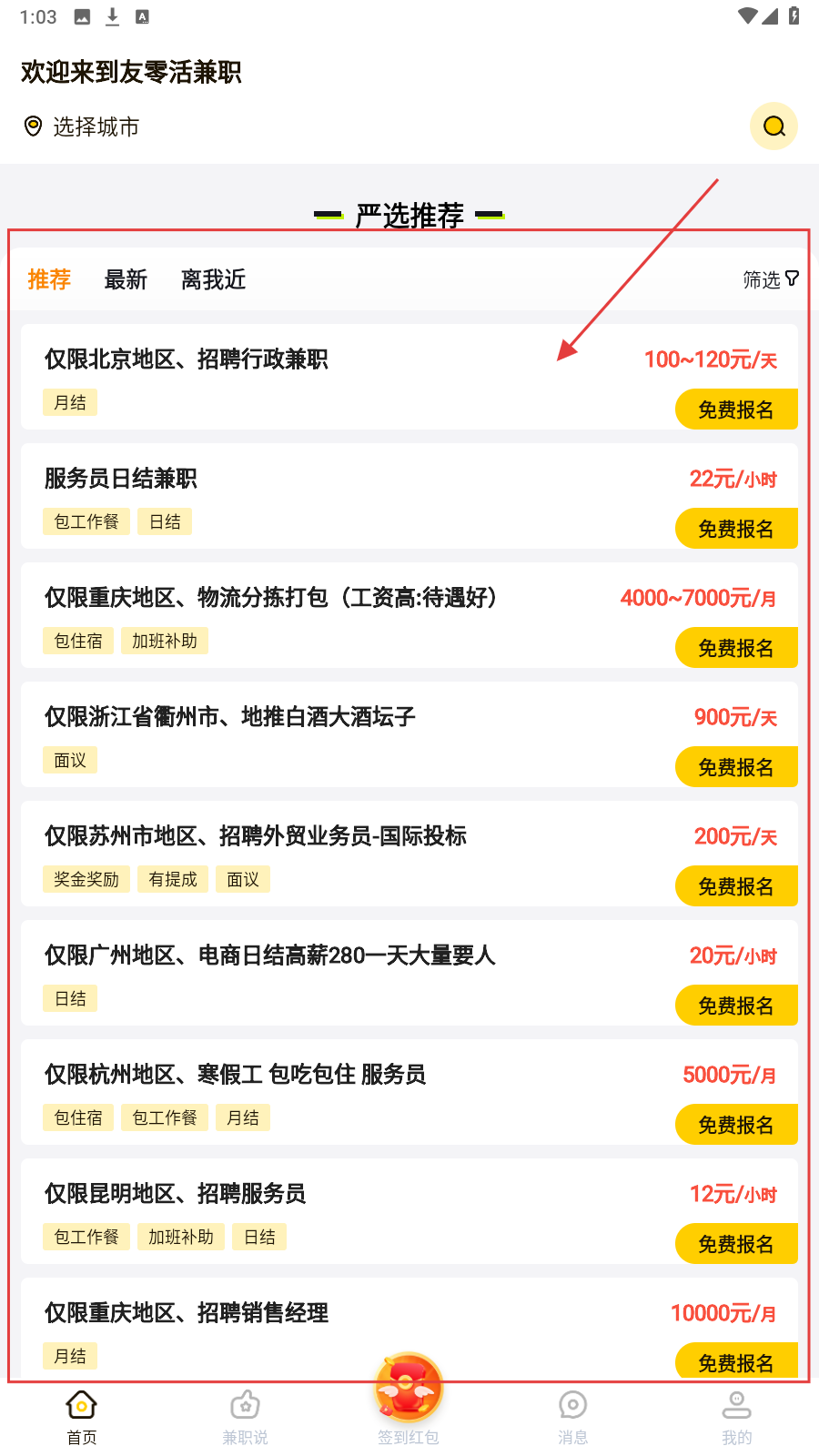 1、进入【友零活兼职】选城市,在【严选推荐】找心仪兼职,看薪资与地区适配度。