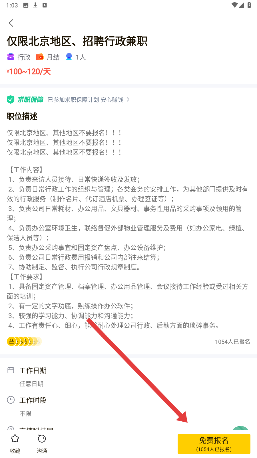 2、点感兴趣兼职,如【仅限北京地区-招聘行政兼职】,详读职位描述与要求再报名。