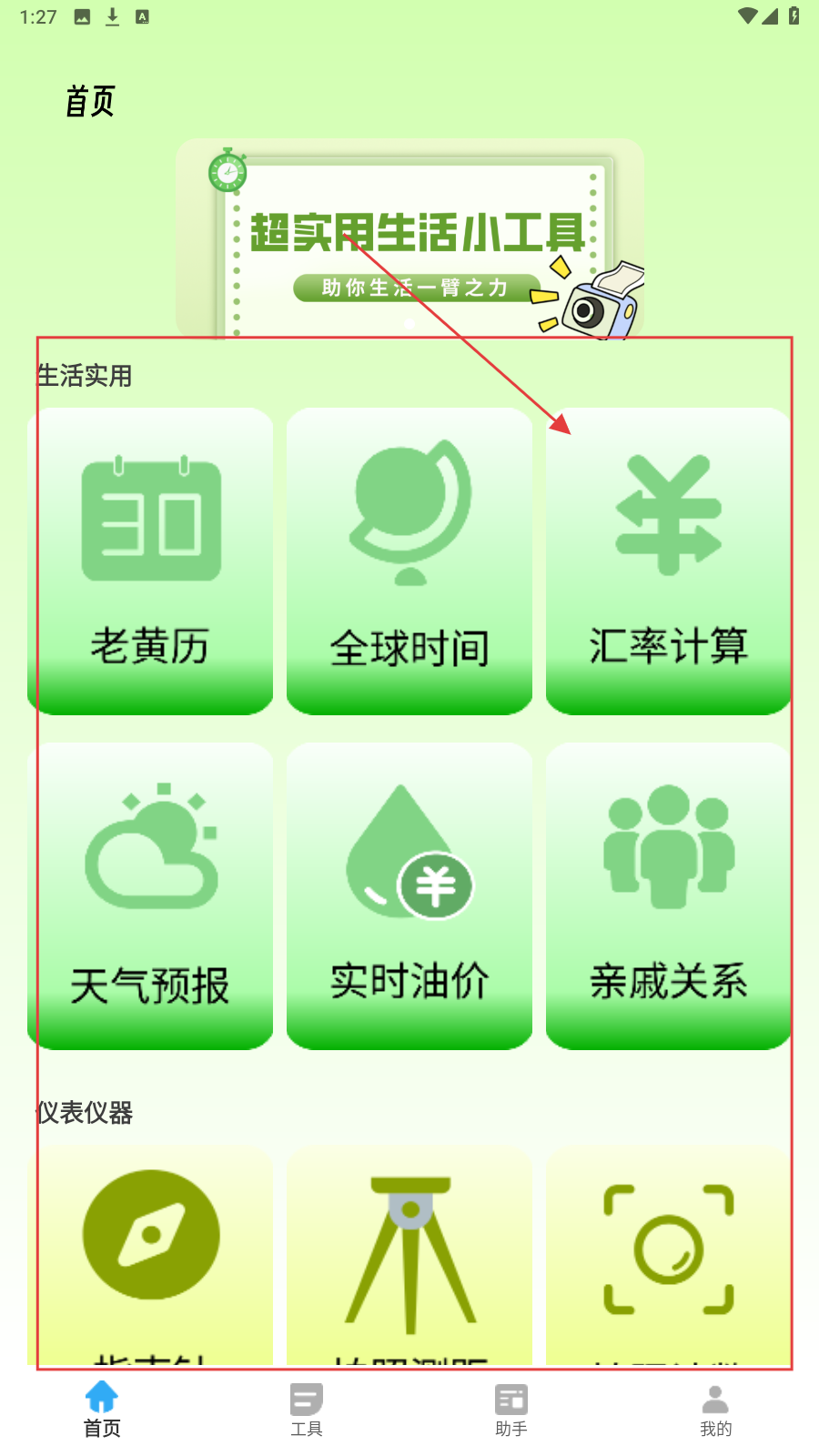 1、打开APP首页,在【生活实用】找【汇率计算】工具,点击进入汇率换算页。