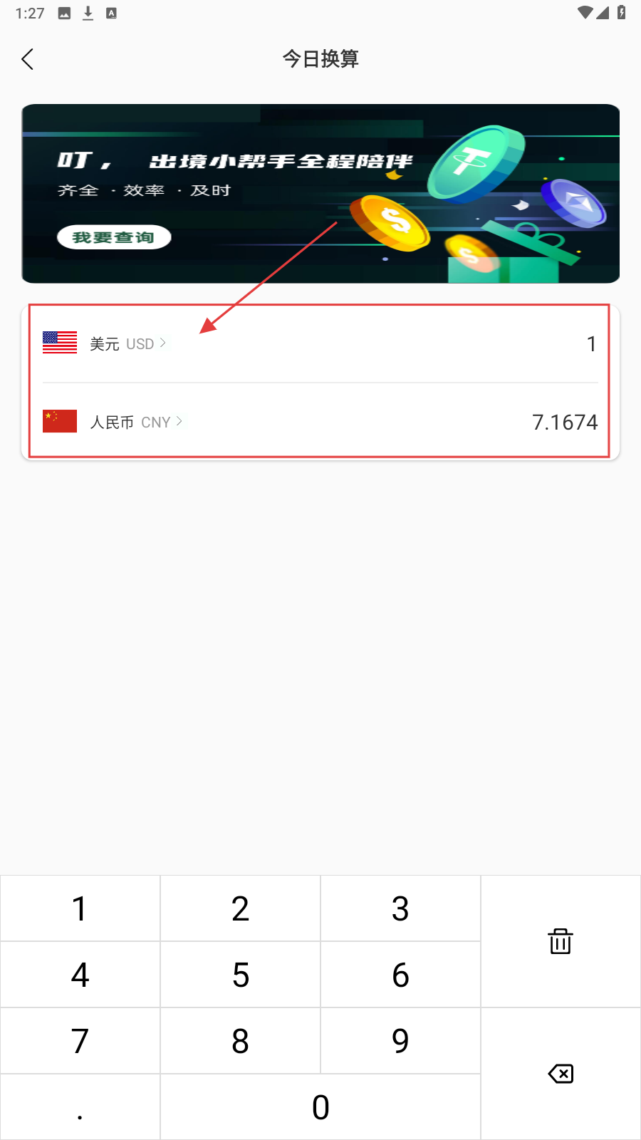 2、在汇率换算页,点现有货币(如【美元USD】),进入货币选择列表更换。