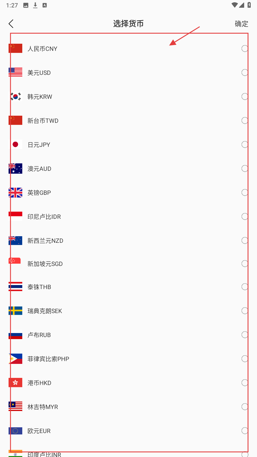 3、到【选择货币】页,选目标货币(如【港元HKD】),点【确定】完成设置。