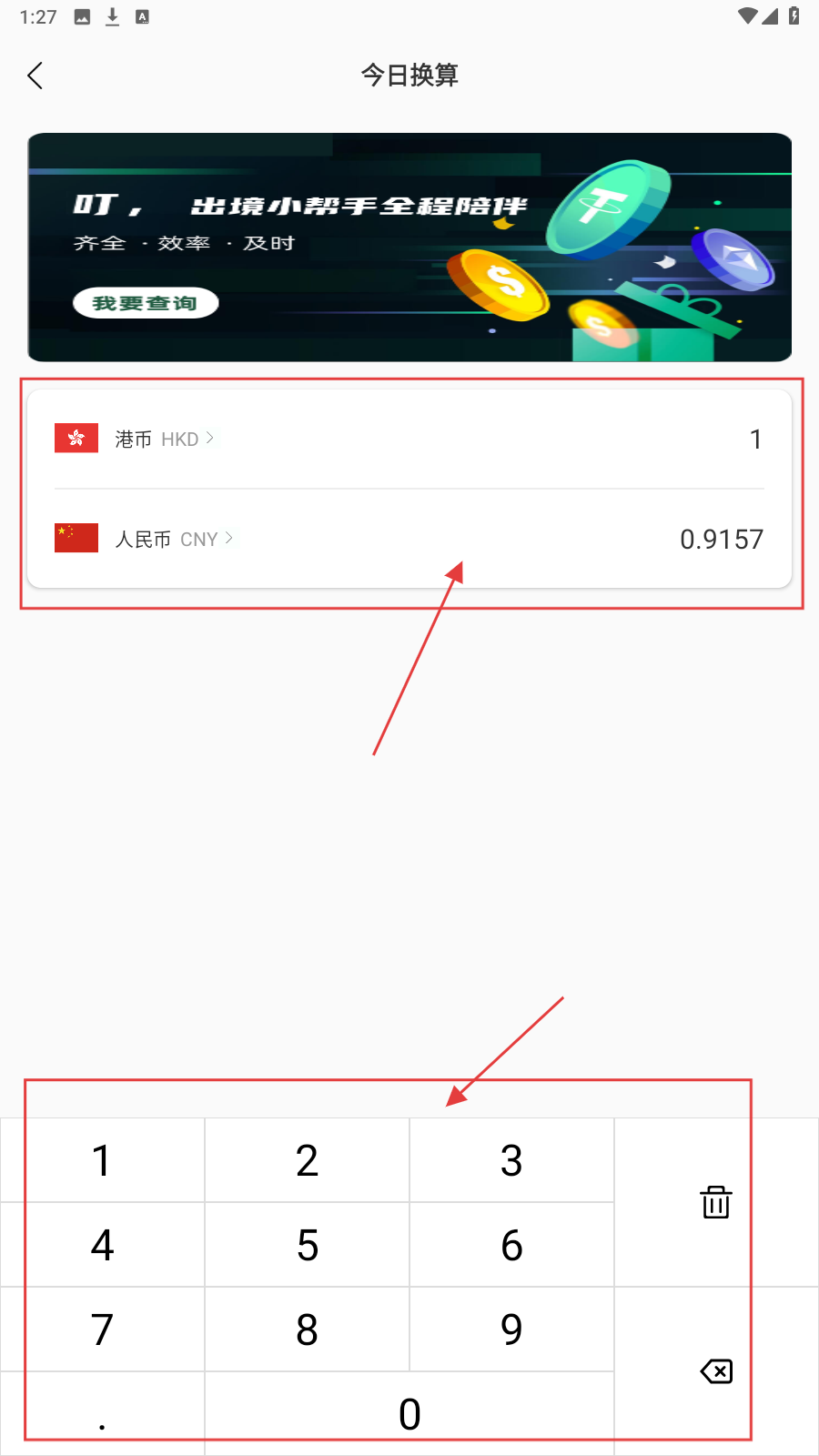4、返回换算页,用数字键盘输入金额,即可按选定货币(如【港元HKD】与【人民币CNY】)换算。