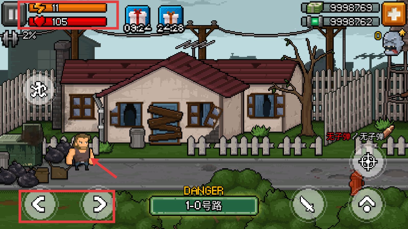 2、借助左下角方向键移动,关注【耐力-11】【血量-105】状态,探索【1-0号路】场景。