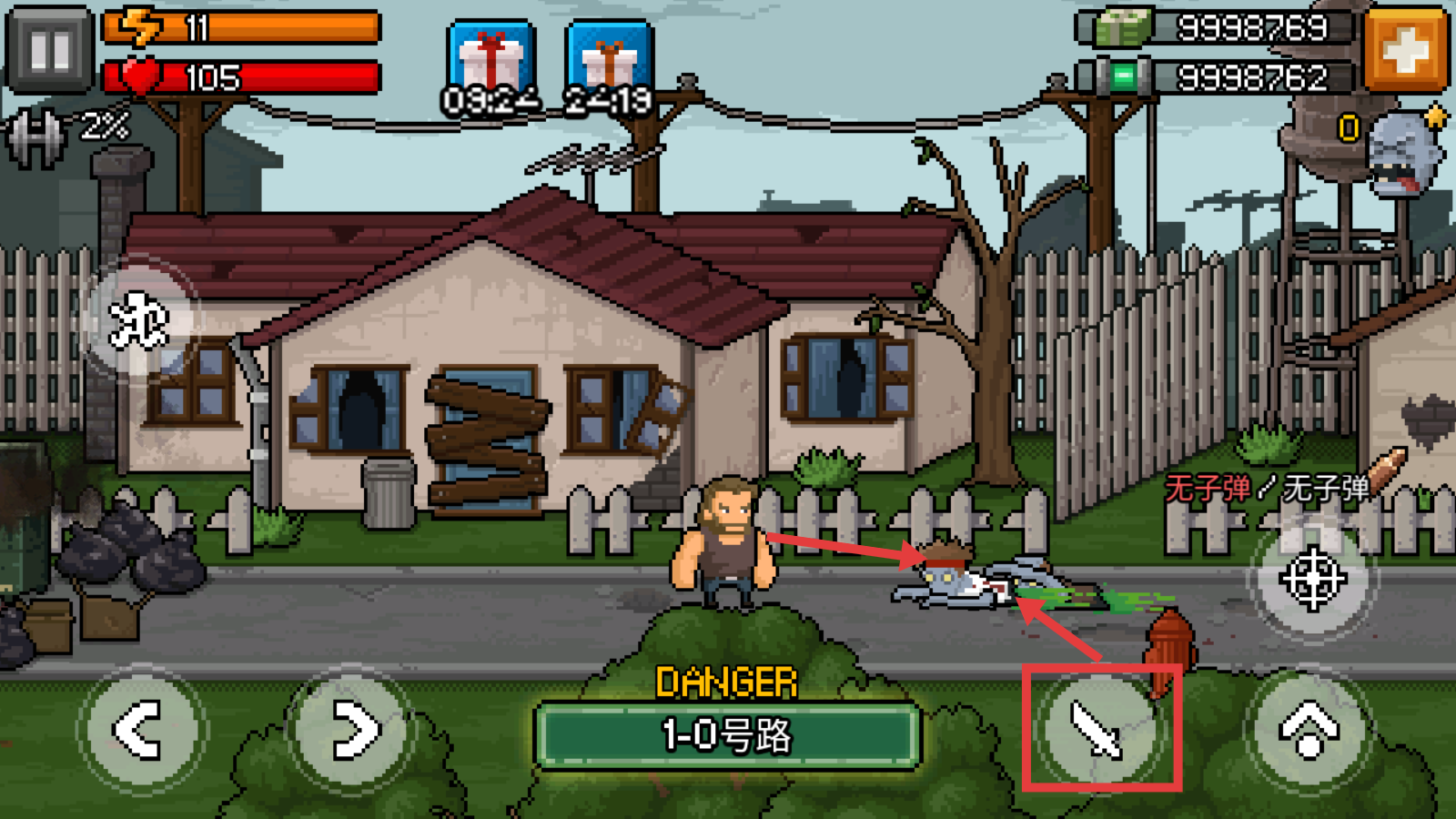 3、遇敌点击右下角【刀】图标,发动近战攻击,清除【1-0号路】的僵尸敌人。