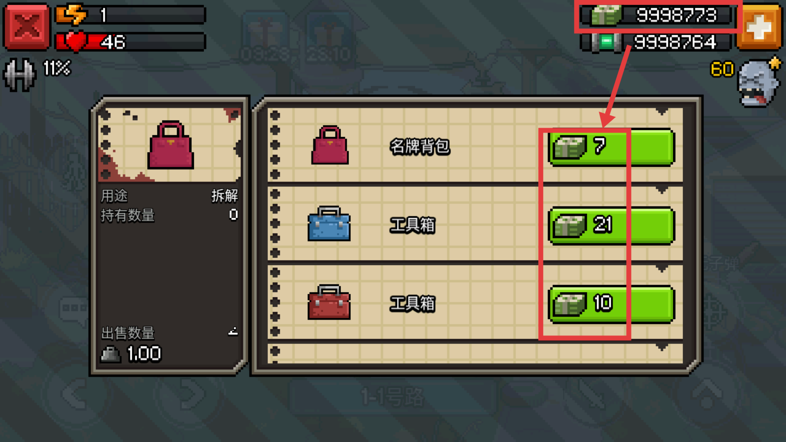 4、进入背包界面,消耗金钱购置【名牌背包-7】【工具箱-21】等道具,强化生存能力。