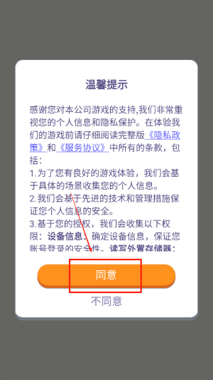 1、同意隐私条款:阅读并同意隐私政策和用户协议,点击“同意”按钮以继续游戏。