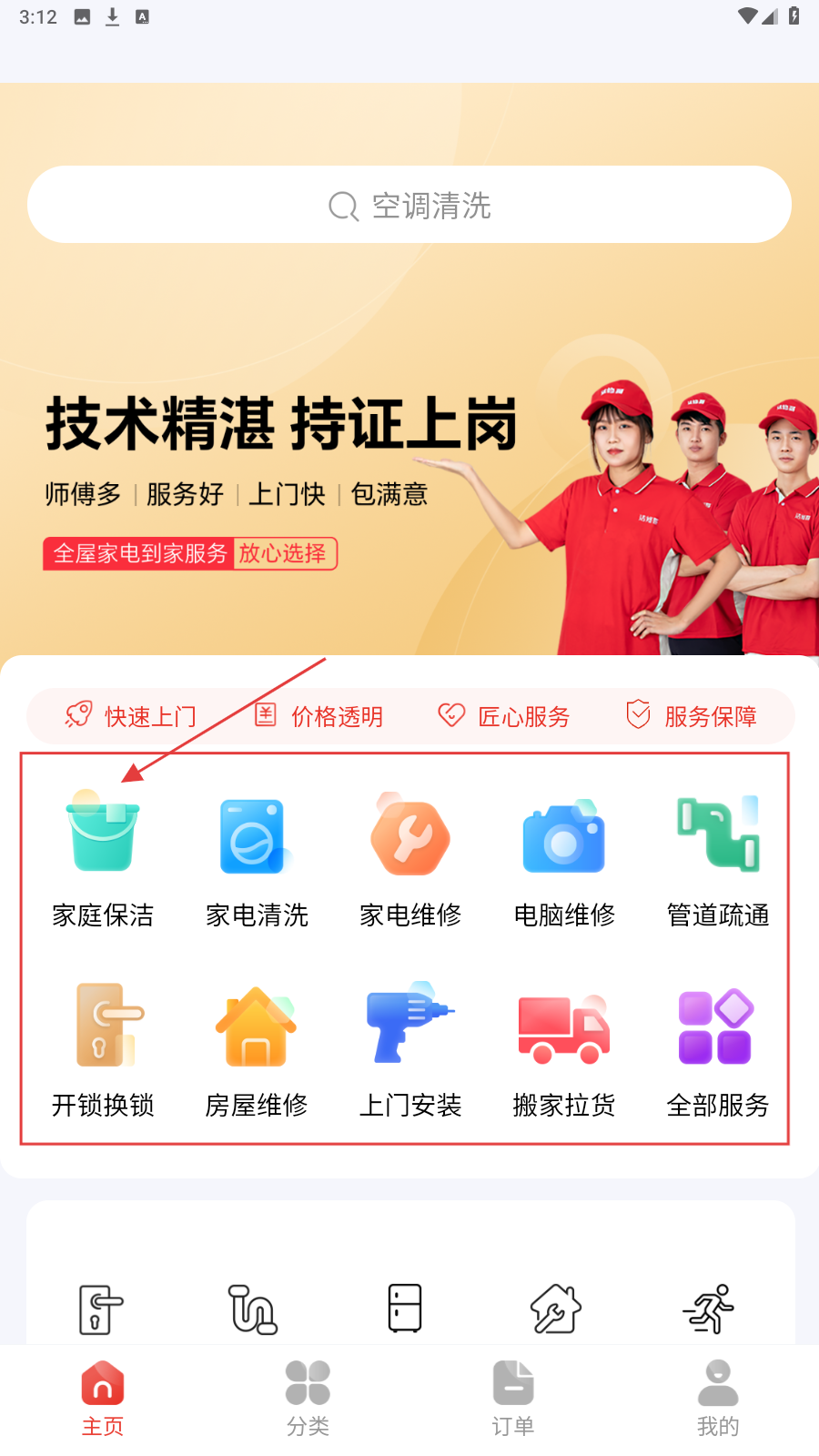 1、打开APP选【家庭保洁】,进入保洁服务分类页面开启需求选择。
