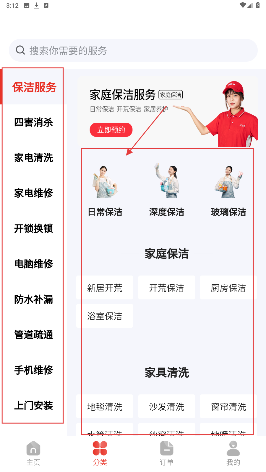 2、在分类页挑具体服务(如日常保洁),精准锁定要预约的项目。