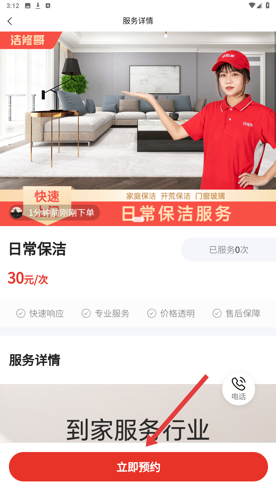 3、进入服务详情页点【立即预约】,启动下单流程确认服务。