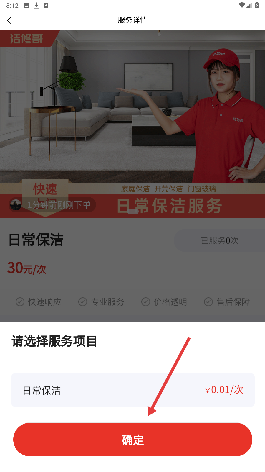 4、选好服务项目后点【确定】,完成家政服务预约操作。
