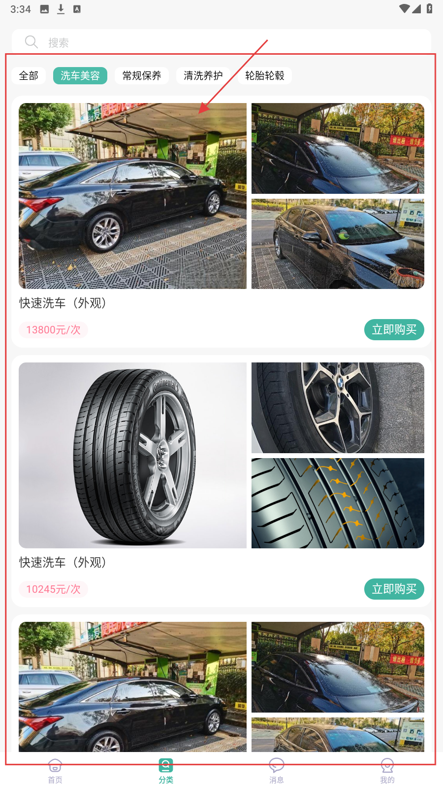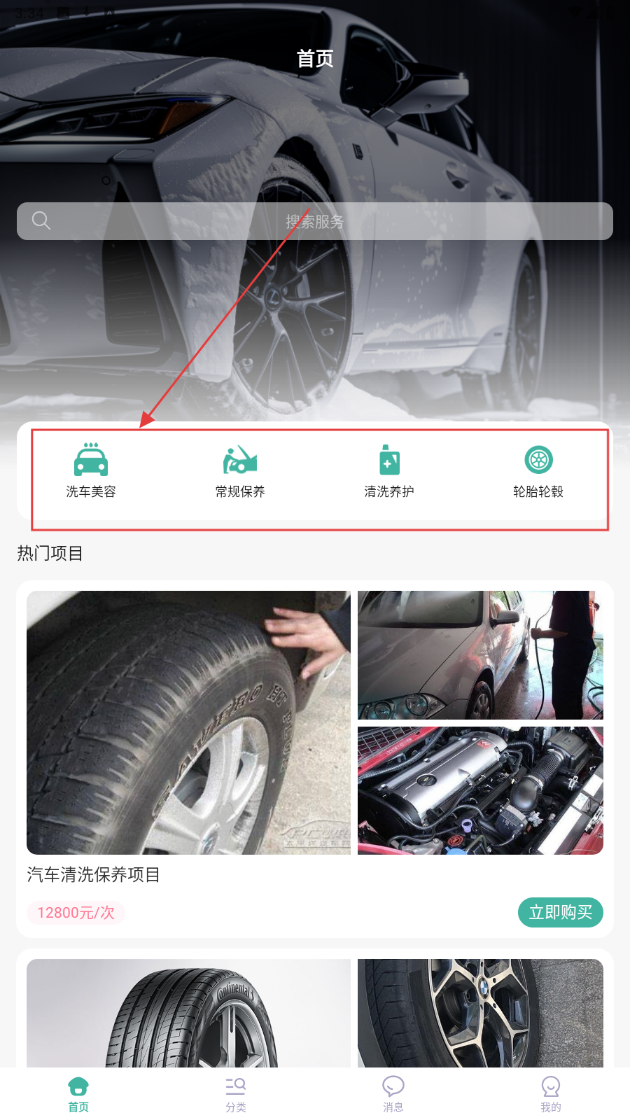 1、打开APP选【洗车美容】,进入对应分类页开启汽车服务选择。