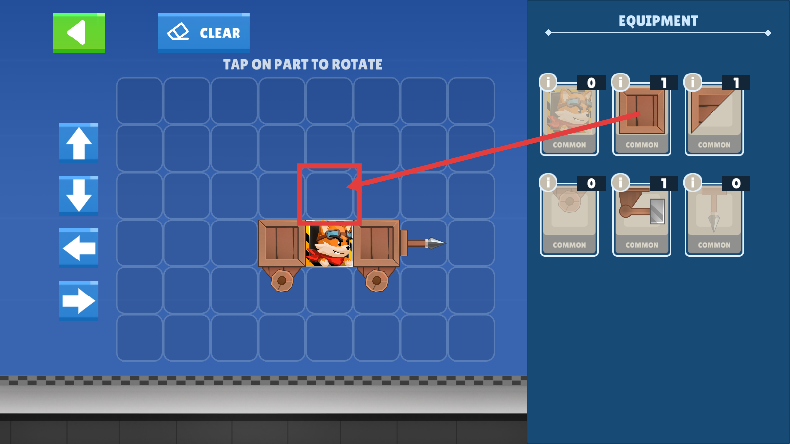 1、在装备界面遵循【TAP-ON-PART-TO-ROTATE】提示,拖动右侧部件至方格,旋转零件搭建战车基础结构。