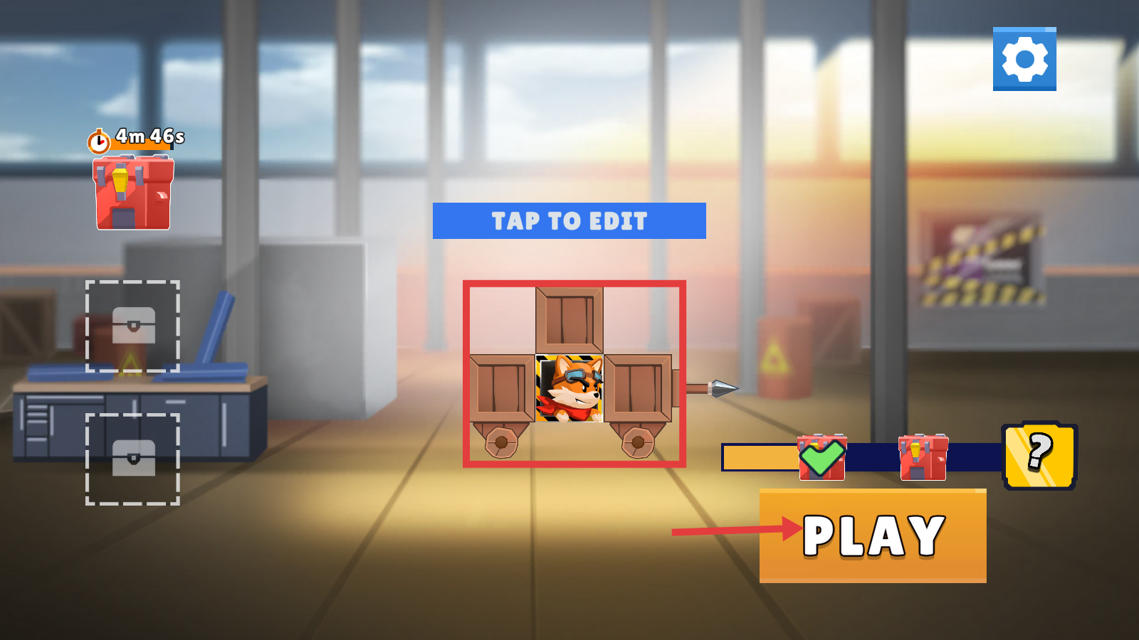 2、战车组装后点击【TAP-TO-EDIT】校验布局,确认无误按下【PLAY】开启比赛,关注左侧限时宝箱进度。