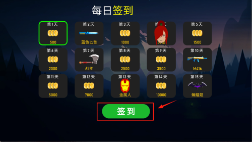 3、领取奖励:进入每日签到界面,点击“签到”按钮,领取第1天500金币与蓝色匕首等新手福利。