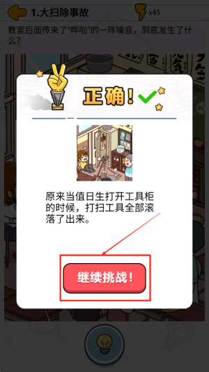 4、完成关卡:在答案正确后,点击“继续挑战”按钮,进入下一关卡继续游戏。