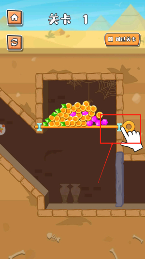 3、拉动正确的针:根据分析选择正确的针拉动,避开危险确保安全,逐步清除障碍,靠近被困的小哥哥。