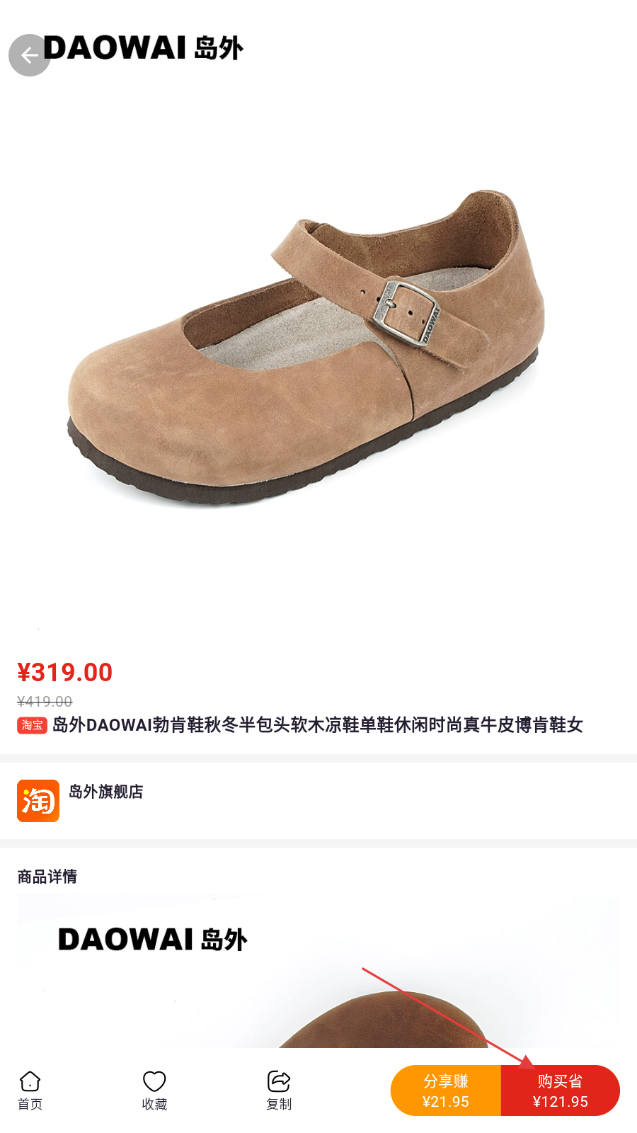 1、首页逛商品区,选感兴趣商品,如【岛外DAOWAI勃肯鞋】,点进详情页查看。