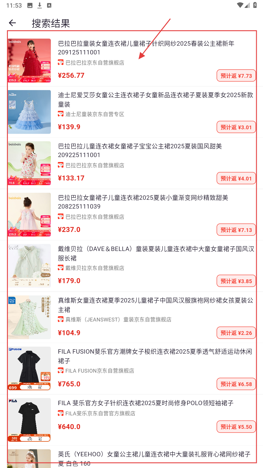 4、搜索结果页,浏览商品列表,选心仪的商品,如巴拉巴拉童装,点进详情下单。